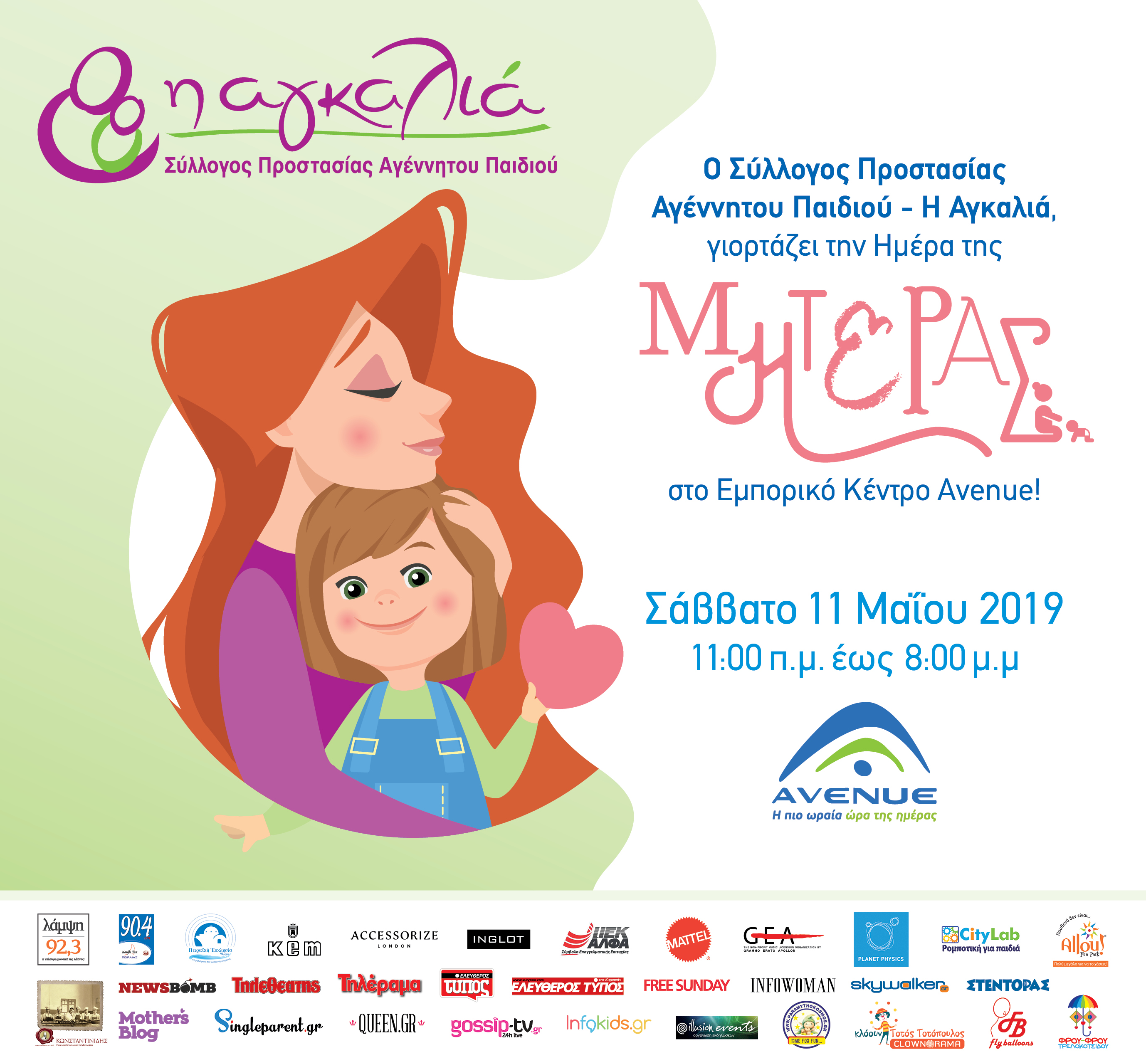 Το Σάββατο 11 Μαΐου (11:00 έως τις 20:00) γινόμαστε όλοι μια μεγάλη «Αγκαλιά», για να υποδεχτούμε στο εμπορικό κέντρο AVENUE τους μικρούς επισκέπτες με μουσικά παιχνίδια, event με ξυλοπόδαρους, κλόουν, ταχυδακτυλουργικά, κατασκευές, ζωγραφική και μασκώτ, αλλά και πολλές εκπλήξεις και δώρα για τα παιδιά και τη Μαμά. Ο ταχυδακτυλουργός Dio θα “μαγέψει”τους μικρούς μας φίλους, ενώ οι σπουδαστές του Τμήματος παιδαγωγικών των ΙΕΚ ΑΛΦΑ θα δώσουν “χρώμα” στην εκδήλωση με την τέχνη του face painting, αλλά και θα ψυχαγωγήσουν τα παιδιά με δημιουργική απασχόληση. Τα «Ζαχαροπλαστεία Κωνσταντινίδης» θα δώσουν χαρά και θα μυήσουν τους μικρούς chef στα μυστικά της ζαχαροπλαστικής και το Planet Physics θα πραγματοποιήσει επίδειξη πειραμάτων φυσικής. Επίσης πλήθος εθελοντών και υποστηρικτών θα πλαισιώσουν χαρούμενα και δημιουργικά την εκδήλωση με παιδικές καλλιτεχνίες και ψυχαγωγικό πρόγραμμα, Φρου-Φρου Τρελοκοτσιδού, ΠΑΡΑΜΥΘΟΚΟΣΜΟΣ, κ.ά.).