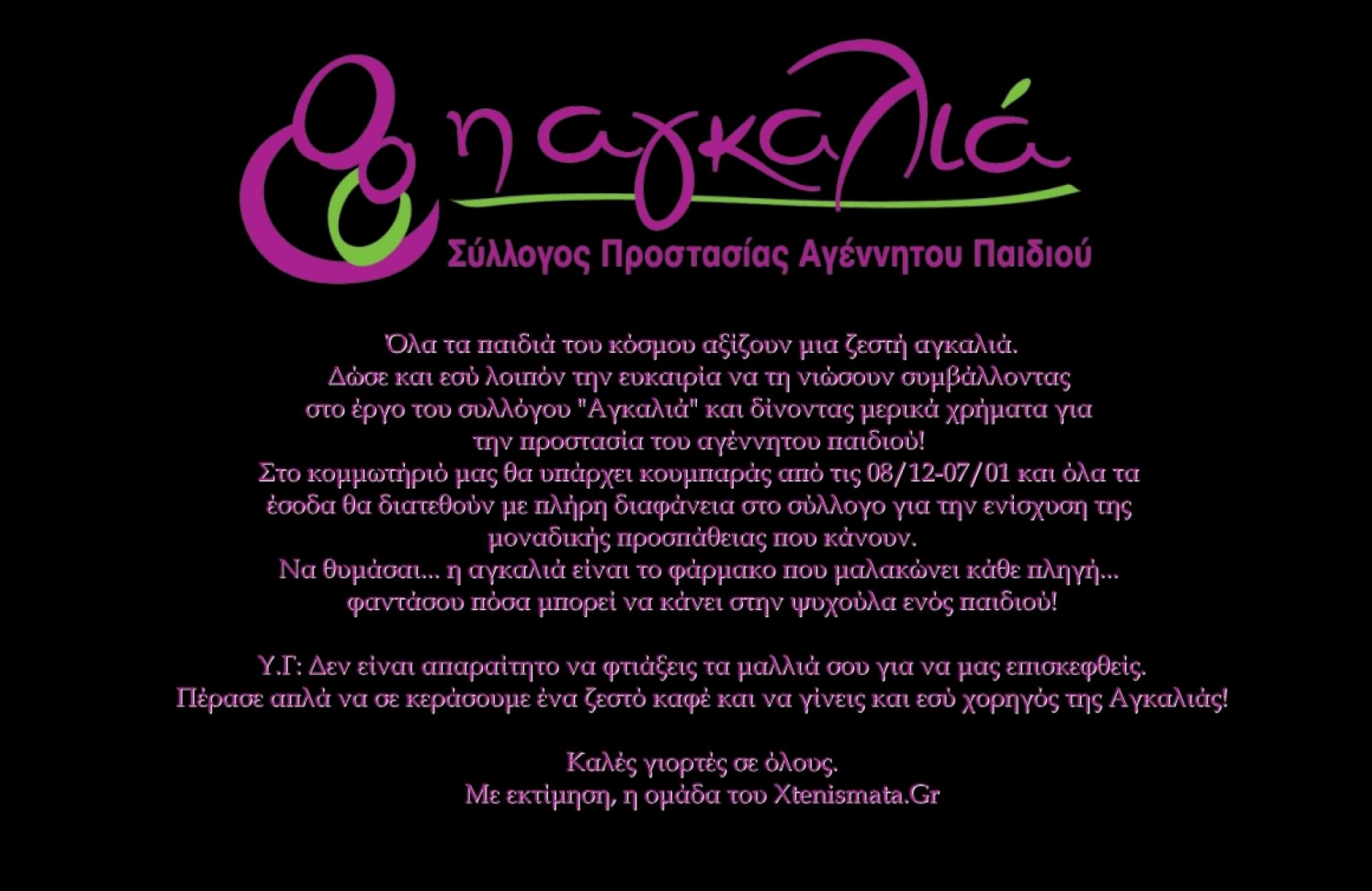 Το Κομμωτήριο Xtenismata.gr, στην Τρίπολη, φέτος τα Χριστούγεννα στηρίζει το κοινωνικό έργο της Αγκαλιάς. Στο κατάστημα του κομμωτηρίου υπάρχει ερανικό κυτίο της Αγκαλιάς από τις 08/12/2018 έως τις 07/01/2019. Ευχαριστούμε το κομμωτήριο xtenismata.gr για την στήριξη του κοινωνικού έργου της Αγκαλιάς.